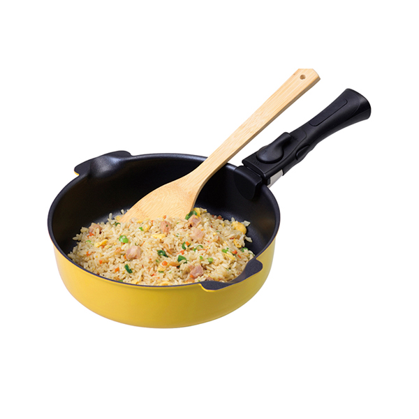 取っ手が取り外せるフライパン兼鍋。内面はこびりつきにくいフッ素樹脂加工でお手入れ簡単。両手卓上鍋や深型フライパンとして使え、着脱ハンドルとシリコーンミトン付きで便利な2WAY調理が可能です。