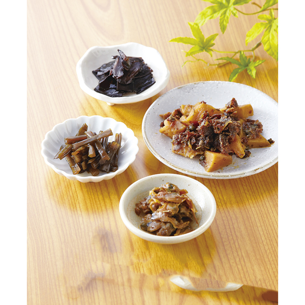 | きゃら蕗60g・牛肉しいたけ50g・浅利しぐれ煮50g・椎茸ひじき50g・ごま昆布60g・椎茸昆布60g・牛肉ごぼう50g・畑の肉みそ煮50g×各1 |