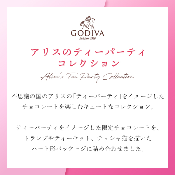 「不思議の国のアリス」の印象的なシーン「ティーパーティ」をイメージしたチョコレートを楽しめる、キュートな「アリスのティーパーティ コレクション」。 ティーパーティを彩る紅茶やカップケーキなどをイメージした限定チョコレートを、物語のシンボルのトランプやティーセット、いたずら好きなチェシャ猫を描いたハート形のパッケージに詰め合わせました。