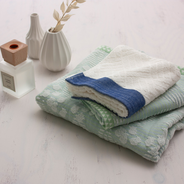 グリーンのタオルにはころんとした形が可愛らしい「すずらん」を、パープルのタオルには日本の伝統柄「さんかく模様」を織り上げました。