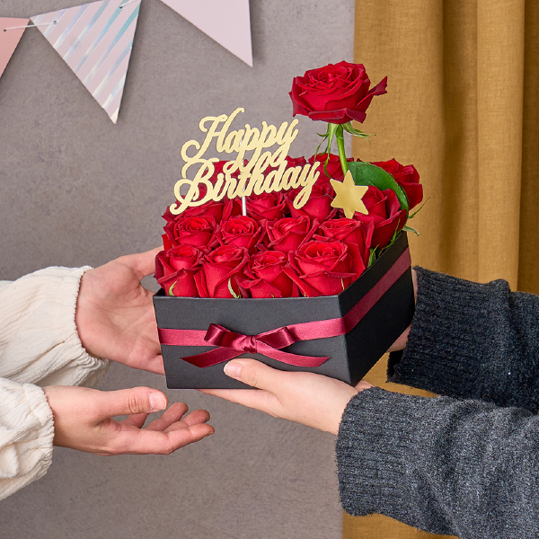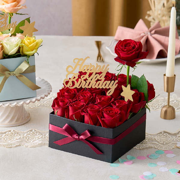 | ボックスアレンジメント(ルージュ)×1HappyBirthdayトッパー付き(アレンジメントサイズW約16×D約16×T約20㎝)、お手入れのしおり ※写真はイメージです。 ※季節により使用輪数が変わる場合がございます。 ※植物につき、色・形・大きさに個体差がある場合がございます。 ※予告なくパッケージまたは商品の仕様が変更になる場合があります。 ※季節によってクール便でお届けします。 ※一部遠隔地・離島などお届けできない地域がございます。 |