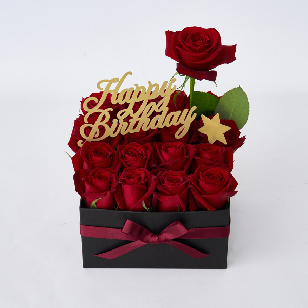 深紅のバラとゴールドのHappyBirthdayのデコレーションで,華やかにお誕生日を彩ります。優雅なゴージャスさを演出します。