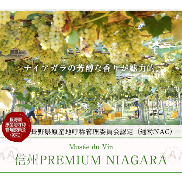 信州松本平産ナイアガラ種を使用。ナイアガラ特有の甘いフルーティーな香りと柔らかな口当たりが特徴の白ワインです。