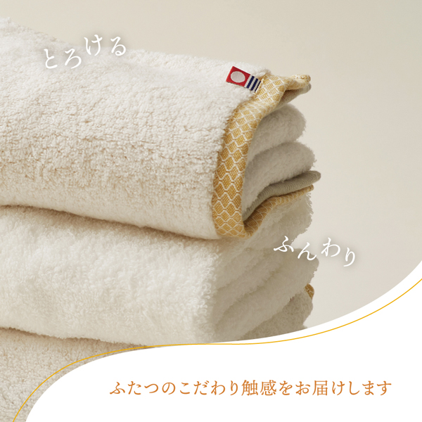 カスタードのようなタオルは空気をたっぷり含んで軽やかな中空糸をふわふわの無撚糸に仕上げたふっくらとろける肌触り。