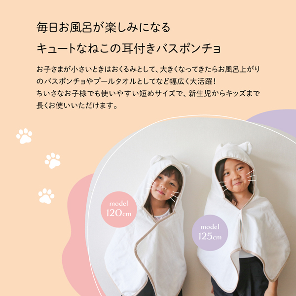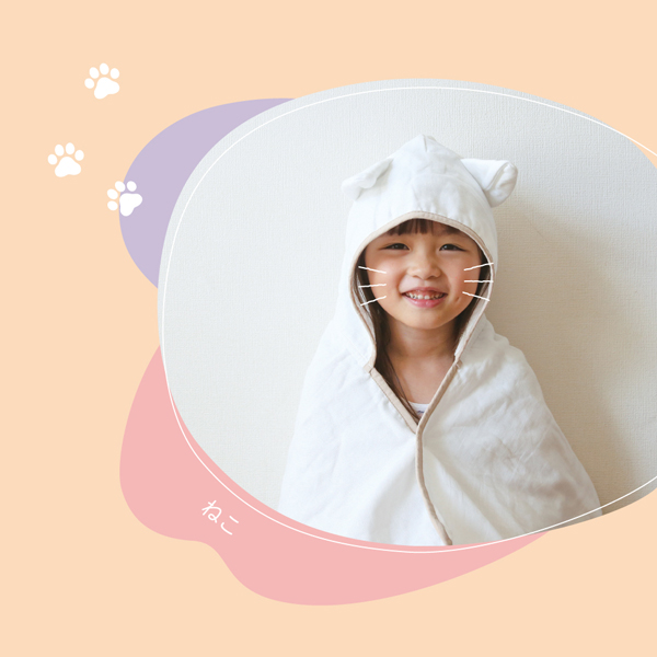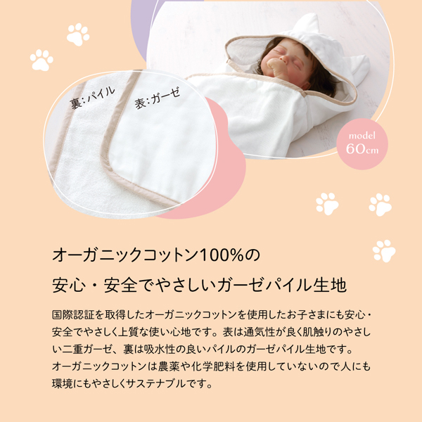 オーガニックコットン100%のやさしい心地のねこのキュートな耳付きバスポンチョ。お風呂上りやおくるみなどにお使いいただけます。国際認証を取得したオーガニックコットンを使用しているのでお子さまにも安心・安全でやさしく上質な使い心地です。お子さまが小さい時はおくるみとして、大きくなってきたらお風呂上りのポンチョやプールタオルとしてなど幅広く大活躍!新生児から5歳くらいまで長くお使いいただけます。