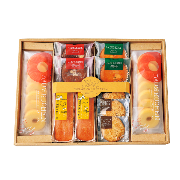 自然の恵みにあふれた環境で育った鶏からとれる、新鮮な有精卵を使ったスイーツは多くのお客様に愛されています。深川カントリーファームが生み出すスイーツはたまごのコクがありながら、自然で上品な甘さ、素朴で飽きのこない味わいが魅力です。1層ずつ丁寧に焼き上げたバームクーヘンをはじめ、ふんわりマドレーヌ、ざくざく食感のオートミールクッキーなどバラエティ豊かな詰合せ。