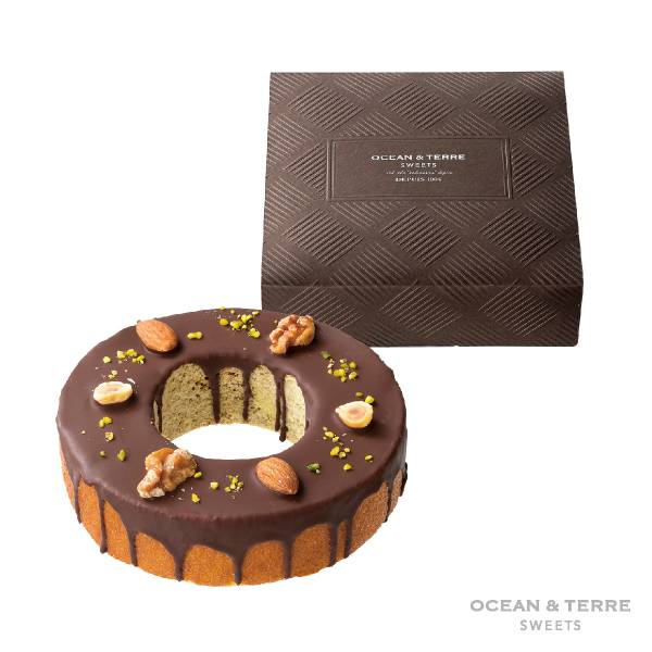 スイートチョコレートをたっぷりとかけ、アーモンド・クルミ・ヘーゼルナッツ・ピスタチオをトッピング。豊かな風味のナッツとスイートチョコレートの相性の良い組み合わせのデコレーションバームクーヘン。