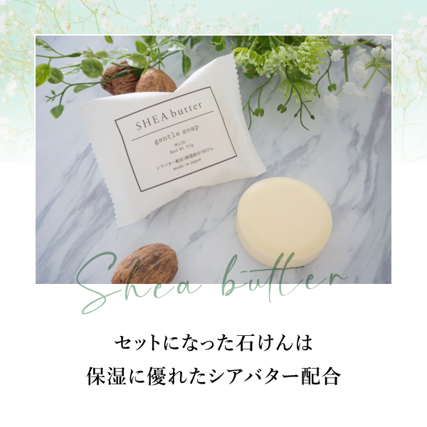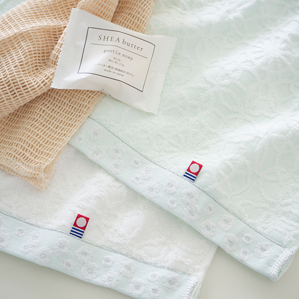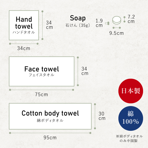 | フェイスタオル(34×75cm)・ハンドタオル(34×34cm)・綿ボディタオル(30×95cm)・石けん(35g) |