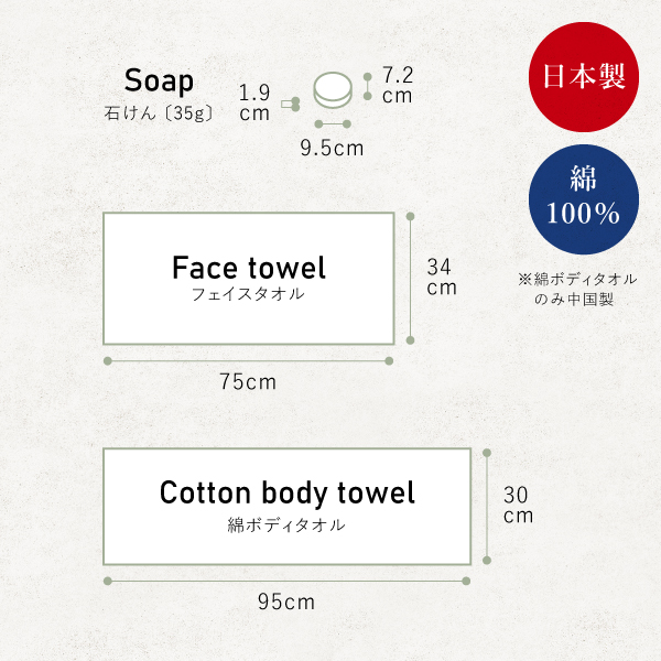 | フェイスタオル2P(34×75cm)・綿ボディタオル(30×95cm)・石けん3P(35g) |