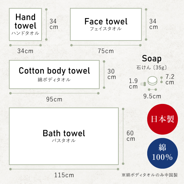 | バスタオル(60×115cm)・フェイスタオル(34×75cm)・ハンドタオル(34×34cm)・綿ボディタオル(30×95cm)・石けん3P(35g) |