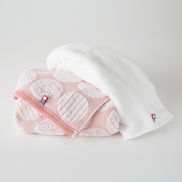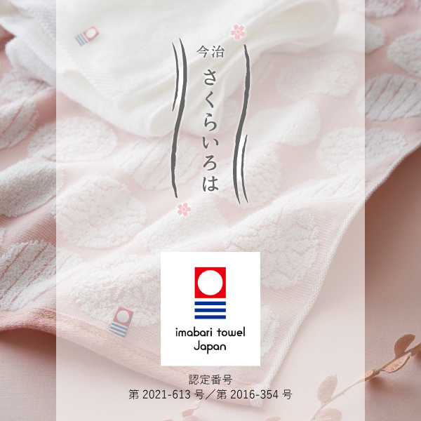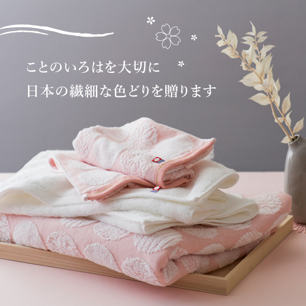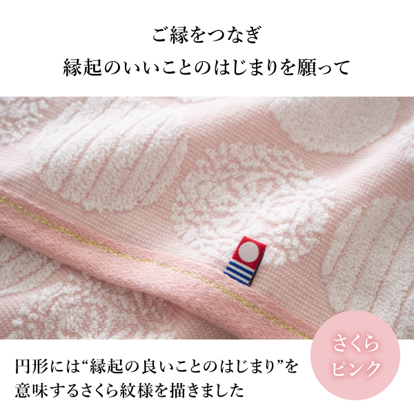 さくら色のタオルには、無限を表し永遠のご縁につながると言われる円形の中に、花が芽吹く春の象徴として縁起の良いことのはじまりを意味する「さくら紋様」を描きました。まっさらな「はじまり」を意味する美しい白のタオルは特殊な工程で作られたタオル専用糸で織り上げました。コシがあるのにやわらかく、毛羽が出にくく長持ちして固くなりにくい理想的なタオルです。