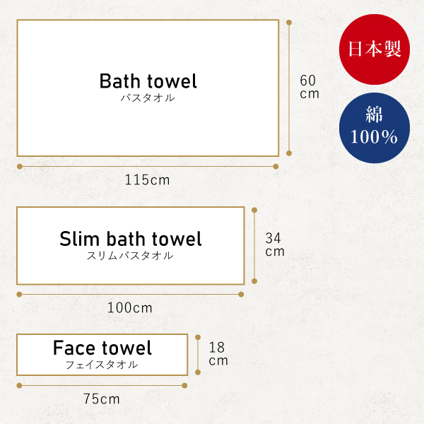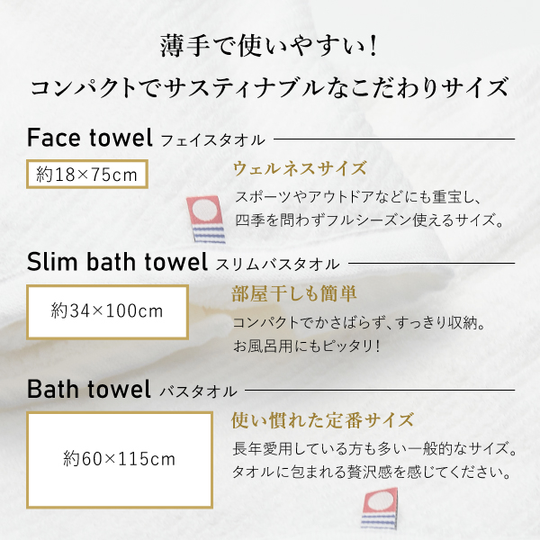 | バスタオル2P(60×115cm)・スリムバスタオル2P(34×100cm)・フェイスタオル(18×75cm) |
