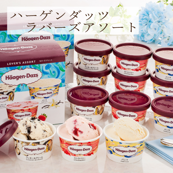 甘酸っぱい苺の中に練乳入りアイスを詰め込んだ苺アイスとハーゲンダッツで人気のフレーバー3種類が入った”ラバーズアソート”をセットにしてお届けいたします。
