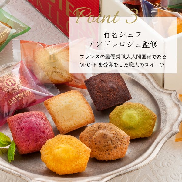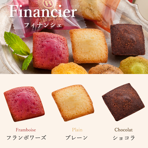 | フィナンシェ(プレーン・ショコラ・フランボワーズ)×各7、マドレーヌ(ピスタチオ・アールグレイ・マンゴー)×各7(計42) |
