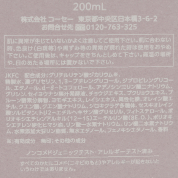 | ■ブランド コスメデコルテ / COSME DECORTE ■内容量 200ml ■ご使用方法 〇朝・夜、乳液でお肌をととのえたあと、または洗顔後の清潔なお肌にお使いください。 〇コットンにたっぷり含ませ、パッティングするようにお肌になじませます。 ■成分 配合成分;グリチルリチン酸ジカリウム※、精製水、濃グリセリン、1,3-ブチレングリコール、ジプロピレングリコール、エタノール、d-δ-トコフェロール、アデノシン三リン酸二ナトリウム、グリシン、セイヨウナシ果汁発酵液、チョウジエキス、ブクリョウエキス、プルーン酵素分解物、ヨモギエキス、レイシエキス、異性化糖、オレイン酸エチル、クエン酸、クエン酸ナトリウム、シロキクラゲ多糖体、セスキオレイン酸ソルビタン、トリ2-エチルヘキサン酸グリセリル、フィトステロール、ポリオキシエチレンアルキル(12~15)エーテルリン酸(8E.O.)、ポリオキシエチレン硬化ヒマシ油、リン酸一水素ナトリウム、リン酸二水素ナトリウム、水素添加大豆リン脂質、無水エタノール、フェノキシエタノール、香料 ※;有効成分 無印;その他の成分 ※商品の改良や表示方法の変更などにより、実際の成分と一部異なる場合があります。実際の成分は商品の表示をご覧ください。 |