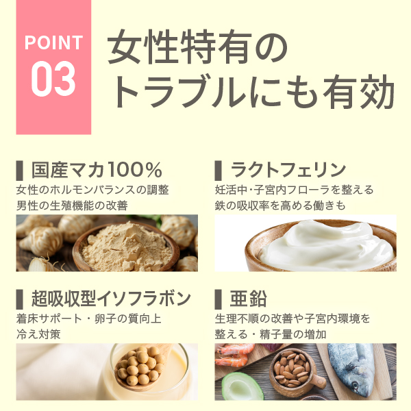 マカ・イソフラボン・コエンザイムQ10・ラクトフェリン・和漢素材などを配合した妊活専用葉酸サプリ。