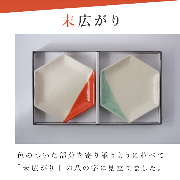 瀬戸焼の「掛け分け」という伝統的な技法を用いて製作し、色のついた部分を寄り添うように並べて、「末広がり」の八の字に見立てました。