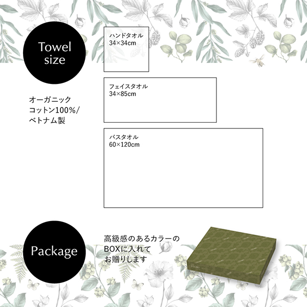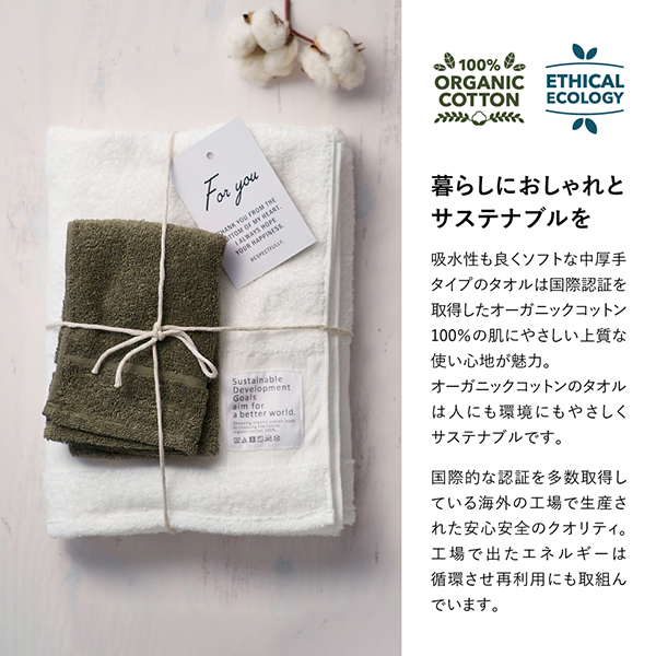 くらしにお洒落を。サステナブルを。ナチュラルだけどかっこいい、国際認証取得オーガニックコットン100%の肌にやさしく上質な使い心地のタオルギフトです。洗濯を重ねても変わらない風合いや、毛羽残りが少ないので使いやすい心地良さがあるタオルです。