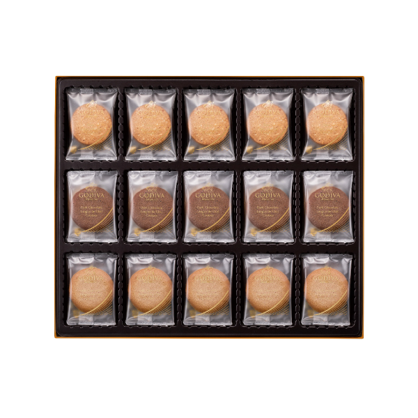チョコレートを練りこんだサクッとした口あたりのラングドシャ生地でチョコレートをサンドした 2 種類のクッキーとサブレのアソートメント。ゴディバならではの贅沢で濃厚な味わいをお楽しみください。
