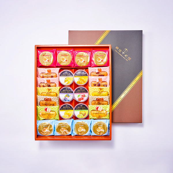 | 【銀座ゼリー】6種 各1個(ラ フランス・マンゴー・キウイ・グレープフルーツ・ブルーベリー・さくらんぼ) 【銀座フルーツフィナンシェ】4個(ストロベリー)3種 各2個(パイナップル・アップル・マロン) 【銀座ヴァッフェル】2種 各4個(バニラ・いちご) |