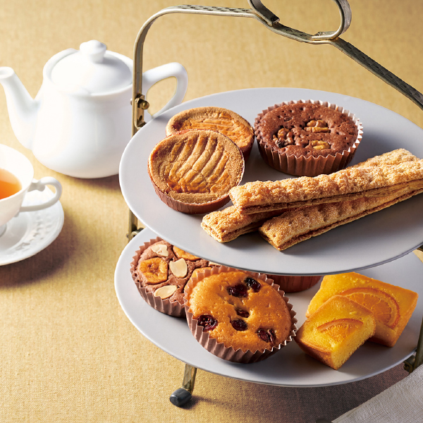 しっとり生地にフルーツやナッツを飾ったプチケーキやオレンジケーキ、さくっとした食感の中にキャラメルの風味が香る少し長いサイズのロングパイ、アーモンドが香ばしく香るフランス伝統の厚焼きクッキーと、ホテルの豊かなティータイムを演出するスイーツを詰め合わせました。