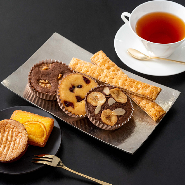 しっとり生地にフルーツやナッツを飾ったプチケーキやオレンジケーキ、さくっとした食感の中にキャラメルの風味が香る少し長いサイズのロングパイ、アーモンドが香ばしく香るフランス伝統の厚焼きクッキーと、ホテルの豊かなティータイムを演出するスイーツを詰め合わせました。