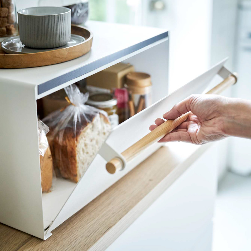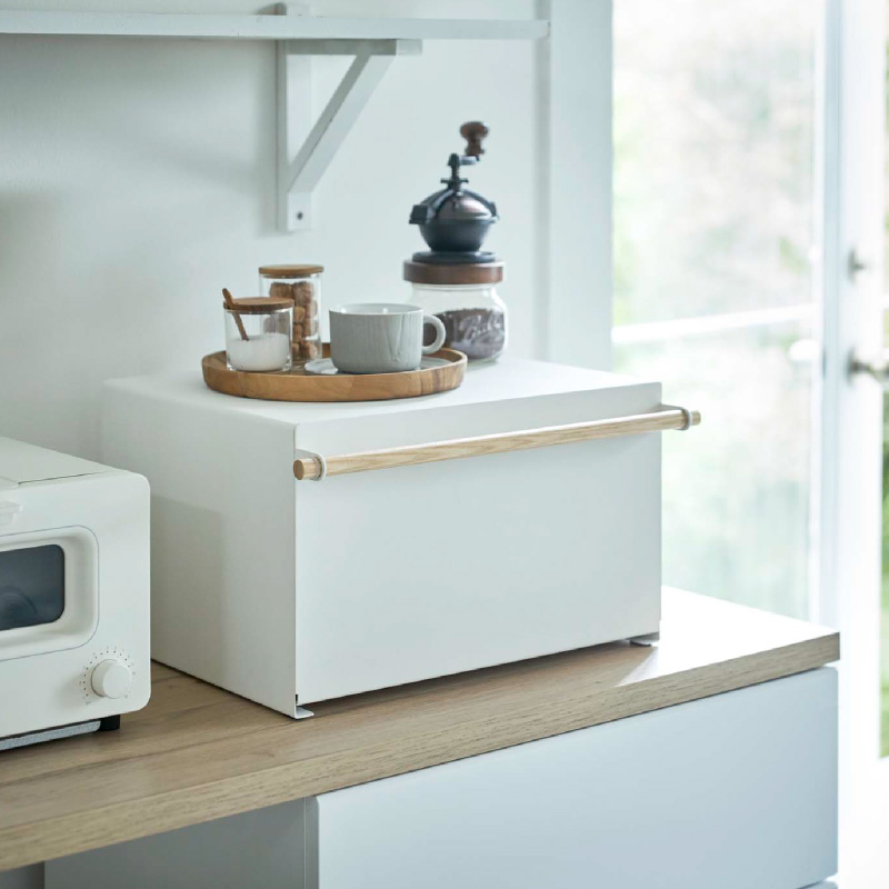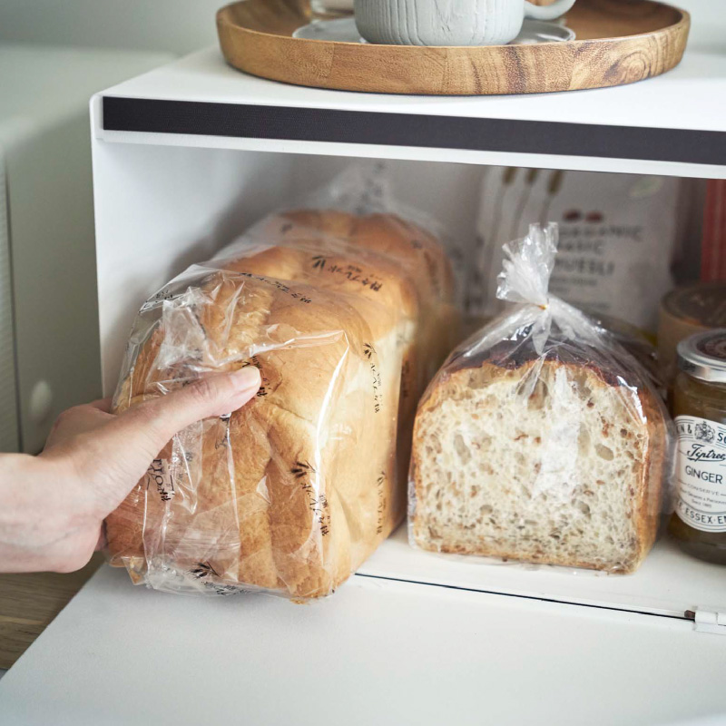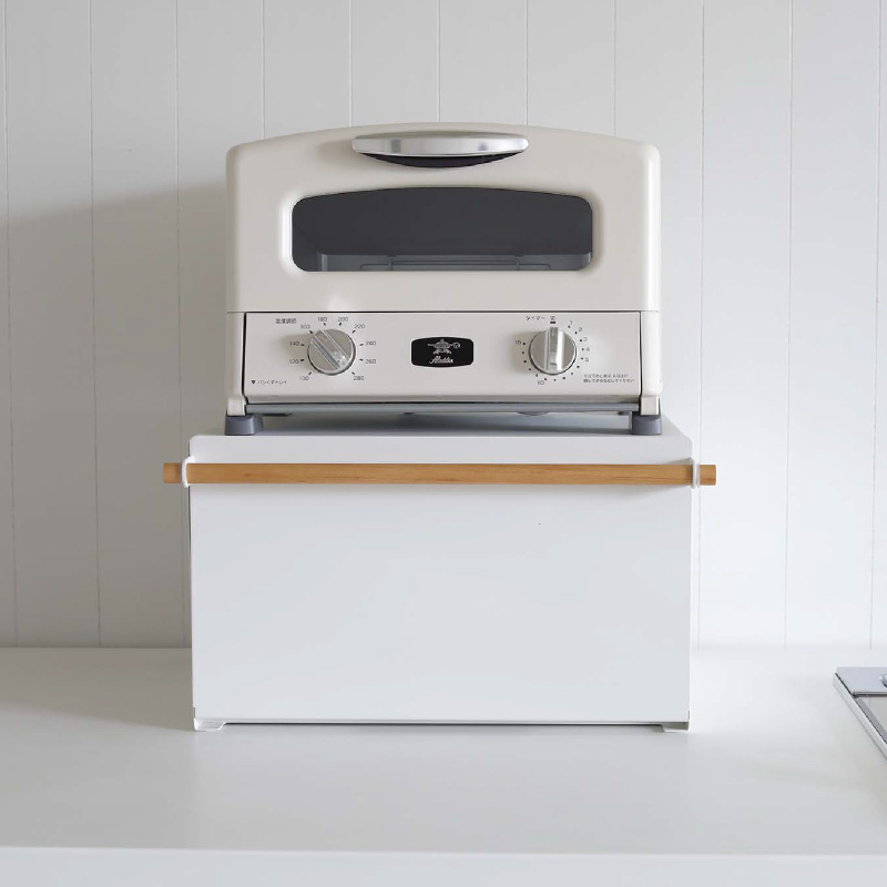 パンや調味料、紅茶などをすっきりとまとめて収納できる27Lの大容量ブレッドケース。キッチンカウンターなどで雑然としがちなパンやお菓子、調味料などを隠しながら美しく収納できる収納ケースです。上にはトースターなどを置くこともできます。