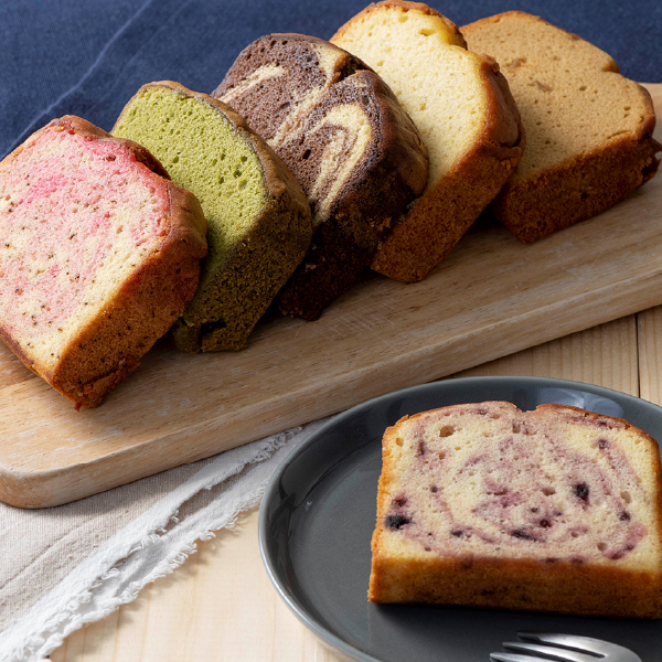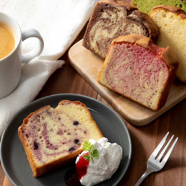 フルーツを混ぜ込んだ大きなしっとりパウンドケーキです。ずっしりとしたサイズ感ですが、ふんわり軽い食感で意外にぺろりと食べられます。朝食代わりやデザートにも。フルーツとフレーバーが組み合わさったそれぞれの味わいをお楽しみください。