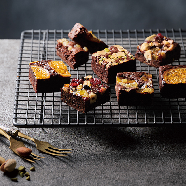 濃厚なチョコレートの生地に、香ばしいナッツや甘酸っぱいフルーツをトッピング。ピスタチオとアーモンド、ごろっとしたパイナップルやネーブル、たっぷりのドライフルーツとナッツ…。おいしさをぎゅっと詰め込んだキューブが、お口に小さなしあわせをお届けします。