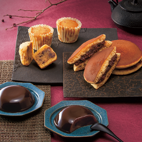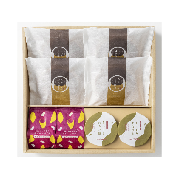 | ふっくらどら焼き×4個、もっちりわらび餅×2個、ほくほく小豆のスイートポテト×2個 |