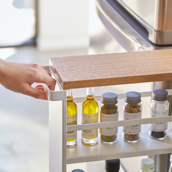 幅約13cmの隙間で使えるハンドル付きのスリムワゴン!キッチン小物、ジャムや雑貨など小さいものからペットボトルや瓶類などの大きいものまで収納可能。ハンドル付きだからラクラク移動!