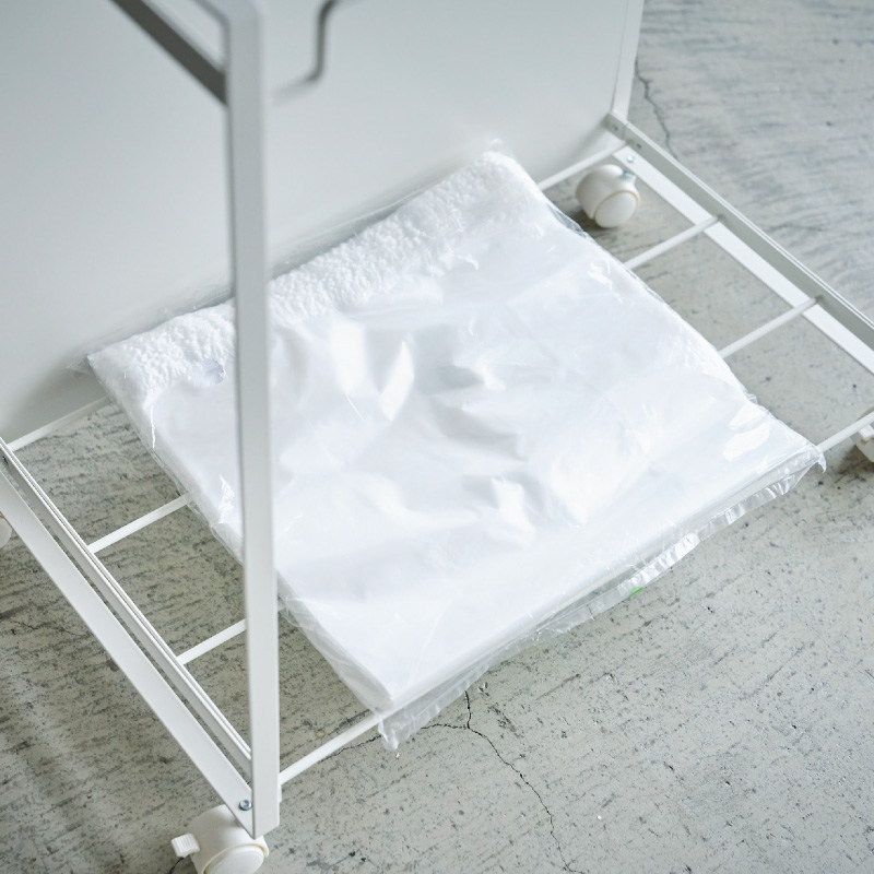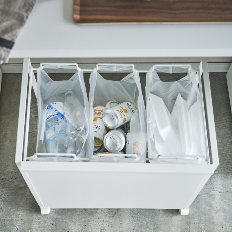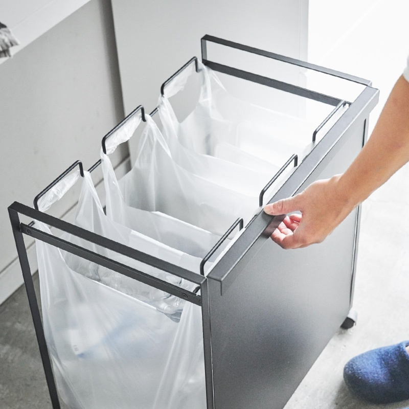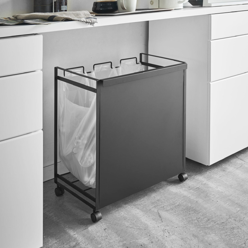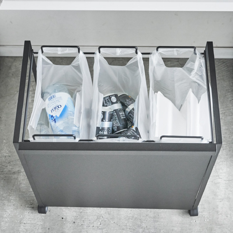 レジ袋を隠して分別できるスタイリッシュな分別ダストワゴン。瓶・缶・ペットボトルなどを分別できます。お手持ちのコンビニやスーパーのレジ袋を引っ掛けてお使いいただけます。キャスターが付いているので、袋の取り外しやお掃除の際の移動もスムーズです。