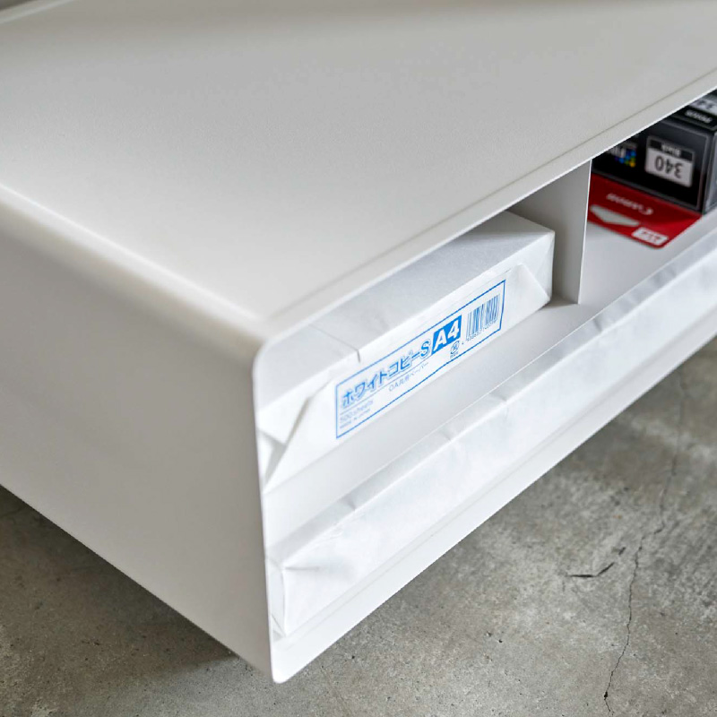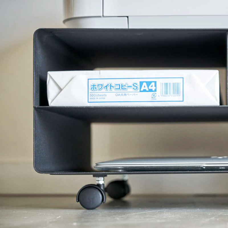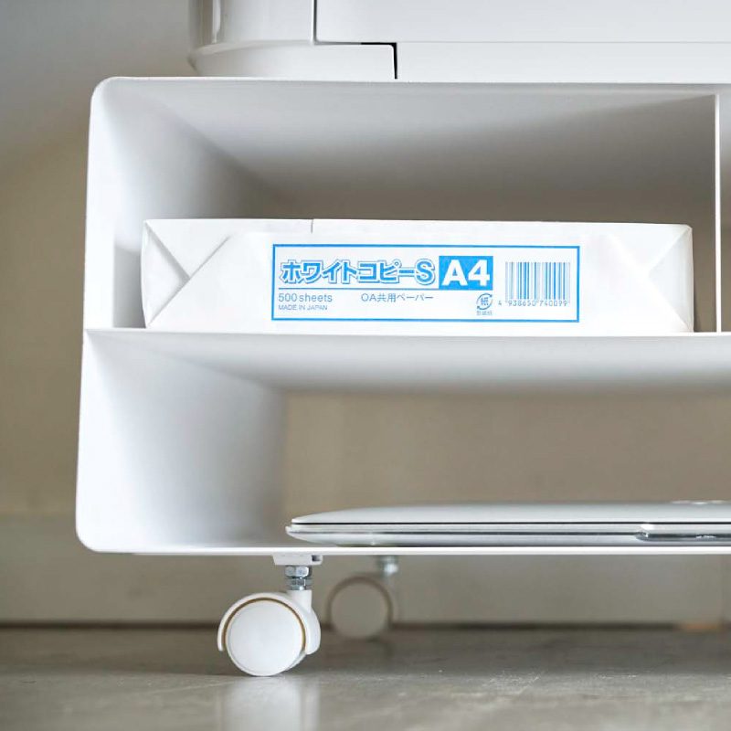 下に印刷用紙やトナーインクを収納できるプリンターラック。使用シーンに合わせてキャスターが着脱できます。A4プリンターがすっきり収まる便利なプリンターラック。キャビネット上などで使用する場合はキャスター無しで置いて使用できます。デスク下などではキャスターを付ければ必要な時だけ出して使えて便利。ラックには印刷用紙やトナー、ノートパソコンなどを一緒にすっきりと収納出来ます。下段にはA3の印刷用紙も収納することができます。