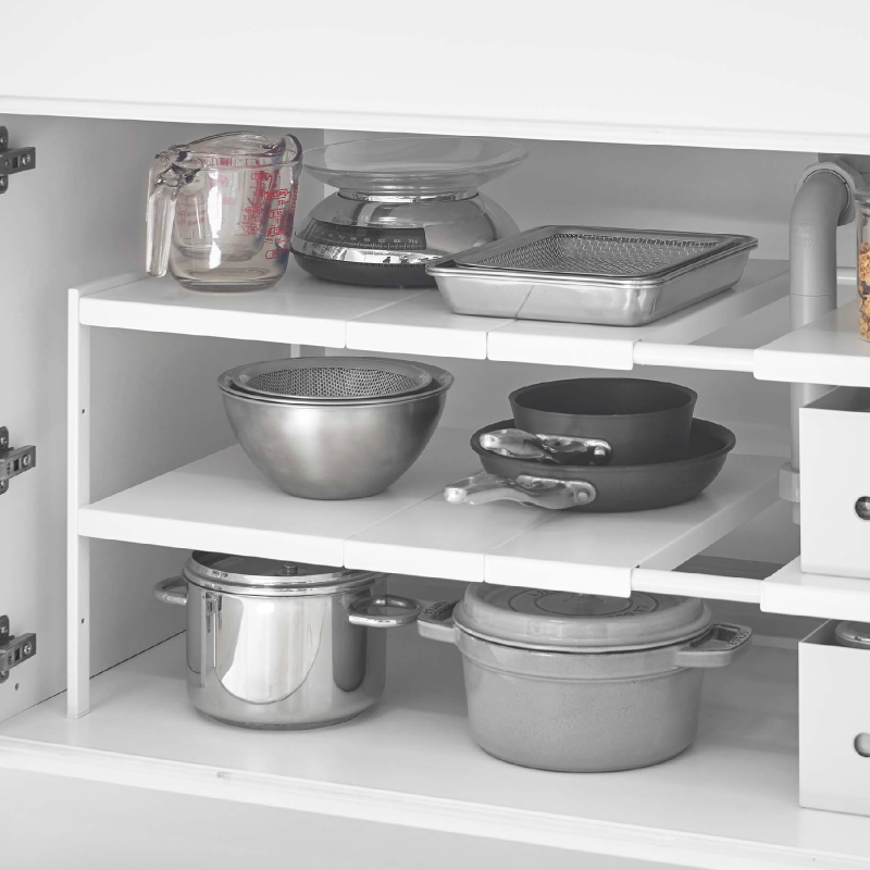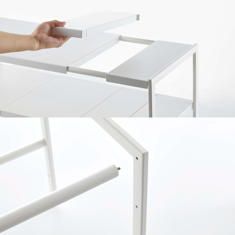 伸縮できるから設置場所の幅に合わせて調整できる丈夫なスチール製伸縮棚!排水ホースを避けて設置できるからスペースを無駄なく有効活用できます。収納するものの高さに合わせて、棚の高さは5.5cmごとに調整できます。