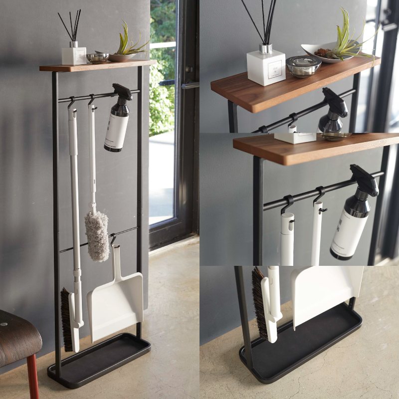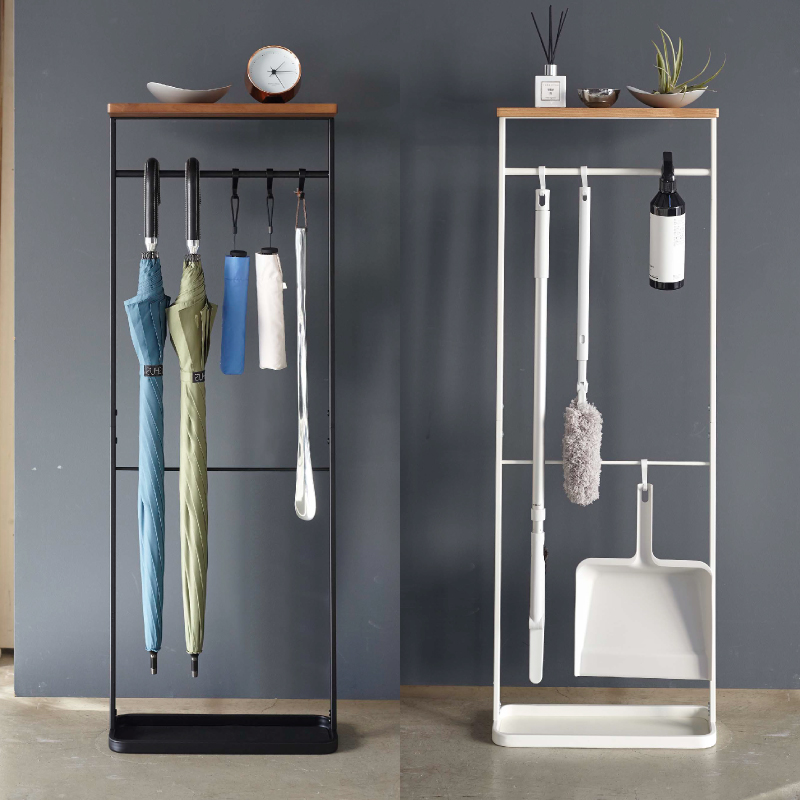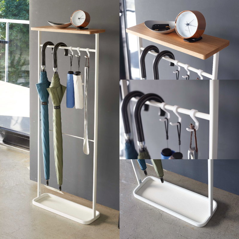 傘を引っ掛けて収納する天板付きのアンブレラスタンド。天板には鍵や時計などを置いて、玄関先を整頓してくれます。付属のフックを使えば、折り畳み傘や靴べらなどの収納場所に困る小物をまとめて収納できます。掃除用品などをまとめて収納するのにも便利です。