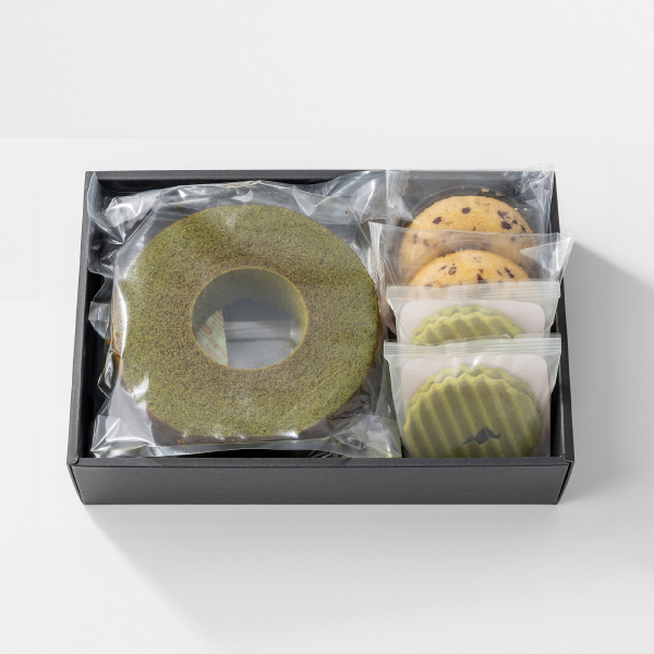 元禄年間創業の老舗「丸久小山園」の宇治抹茶を使用した上品で芳醇な香りが広がるバウムクーヘン。優しい甘さの小豆の焼きドーナツに厚みのある波型クッキーに、口どけの良いクリームをサンドしたヴァッフェルもご一緒に。