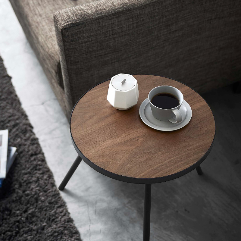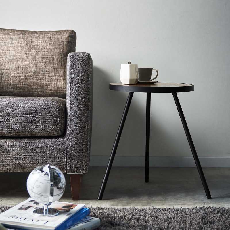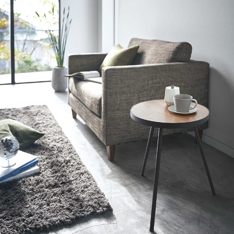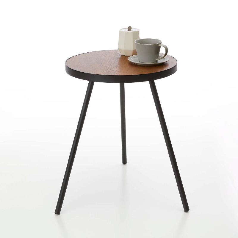 天然木の天板とスチールの組み合わせが美しいシンプルな丸型サイドテーブル。