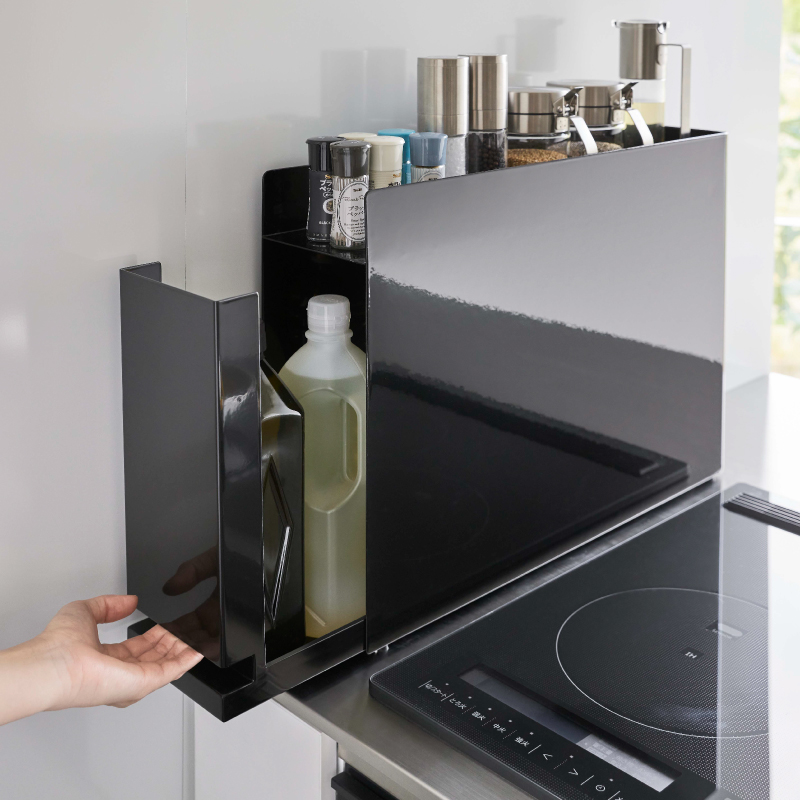 引き出し式で、醤油やみりんなどの大きい調味料ボトルも入る大容量な収納。調味料を油はねや調理汚れから防げちゃいます♪