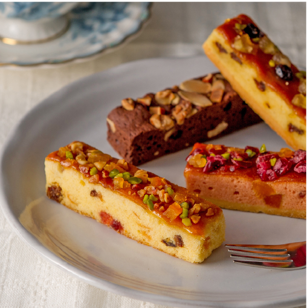 ドライフルーツやナッツでデコレーションした見た目にも華やかな4種類のスティック型のケーキです。