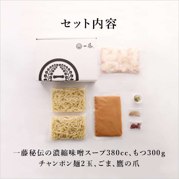 | 一藤秘伝の濃縮味噌スープ 380cc、もつ300g、チャンポン麺 2玉、その他(ごま、鷹の爪、作り方説明書) ※野菜はセット内容に入っておりませんので、キャベツ、ニラ、ゴボウなどお好みでご準備ください。 |