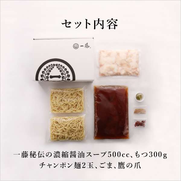 | 一藤秘伝の濃縮醤油スープ 500cc、もつ300g、チャンポン麺 2玉、その他(ごま、鷹の爪、作り方説明書) ※野菜はセット内容に入っておりませんので、キャベツ、ニラ、ゴボウなどお好みでご準備ください。 |