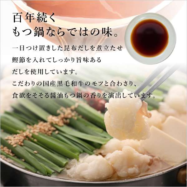 博多もつ鍋の昔ながらの定番の味。かつお昆布ダシに濃口と醤油の合わせ醤油で味付け。