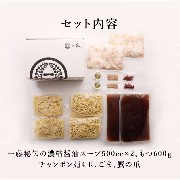 | 一藤秘伝の濃縮醤油スープ 500cc×2、もつ600g、チャンポン麺 4玉、その他(ごま、鷹の爪、作り方説明書) ※野菜はセット内容に入っておりませんので、キャベツ、ニラ、ゴボウなどお好みでご準備ください。 |