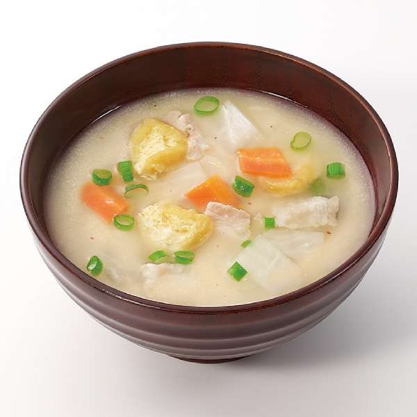 やさしい風味の酒粕と豚肉の旨みが特徴のかす汁です。大根、人参、油揚げが入っています。お味噌と具材を別々にフリーズドライする「ニコニコ製法」により、それぞれの持つ風味がより一層高くなりました。