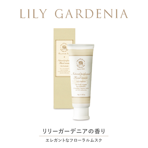 【リリーガーデニア】エレガントなフローラルムスクの香り。気品溢れるユリと上品なクチナシを中心にジャスミン、スズラン、ローズなど優雅で濃厚なホワイト系の花々を贅沢にブレド。ムスクやサンダルウッドがスパイスとなり、官能的なオトナの艶やかさを演出。