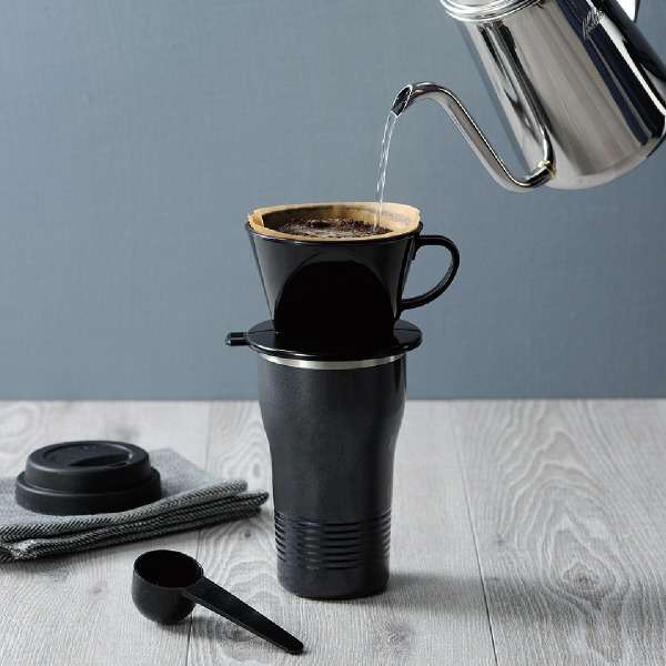 ドリッパーを付け替え、淹れたての温かさと味わいを会社や自宅のデスクで楽しめる真空二重構造のタンブラーです。