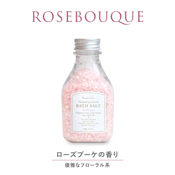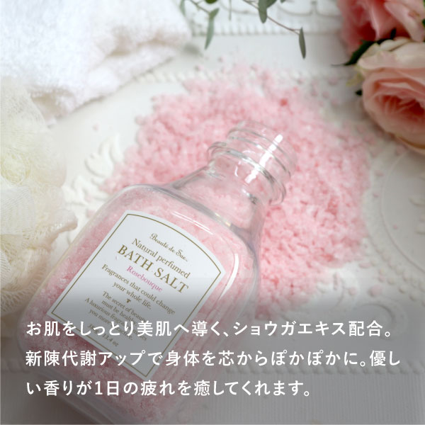 香り豊かなバスソルト。お肌をしっとりとさせるローズヒップ油、ホホバ油、ハチミツなど配合。