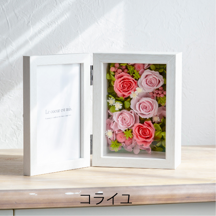 | プリザーブドフラワー:ローズ、アジサイ、ペッパーベリー ドライフラワー:木製フレーム(MDF)、ガラス、カード(紙) |