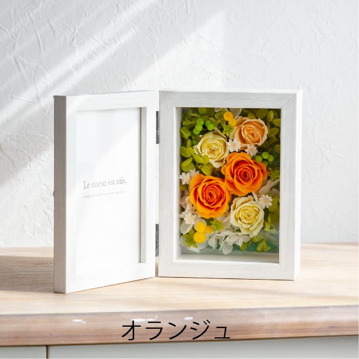 フラワーと写真を一緒に楽しめるブック型のフォトスタンドフラワーギフトです。そのまま渡すのはもちろん、家族の写真やペットの写真を入れて贈るのも素敵。自立するので場所を選ばずに飾ることができます。愛らしい小花とナチュラルなグリーンが明るい気持ちにさせる、お部屋のアクセントとして楽しめるインテリアです。