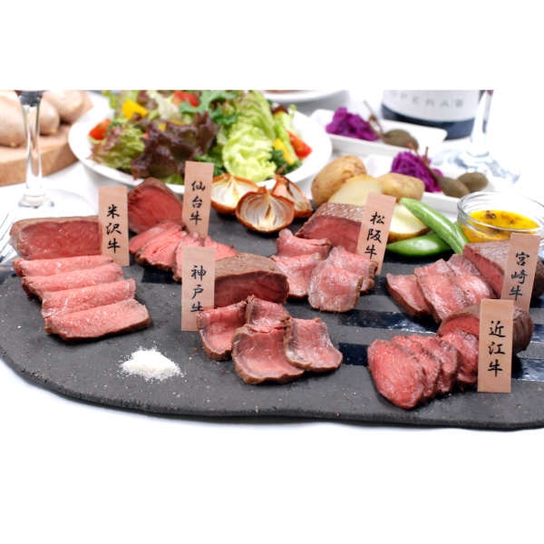 | 神戸牛ローストビーフ・松阪牛ローストビーフ・近江牛ローストビーフ・米沢牛ローストビーフ・仙台牛ローストビーフ・宮崎牛ローストビーフ 各50g×1個、オニオンソース40g×3 |